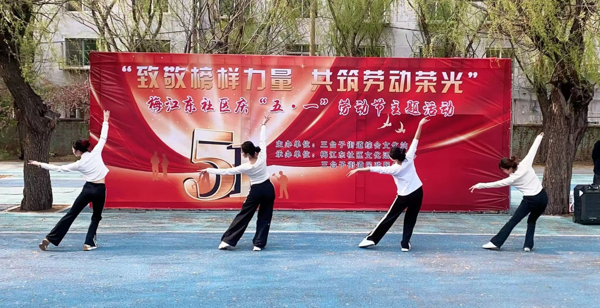 随后的古典舞《入画江南》则如清风拂面,将观众引入诗画意境。舞者们手持绢伞翩然登场,湖蓝色渐变纱裙随“雨滴”音效轻盈摆动,演绎烟雨长廊下的踏青、采莲等场景。台下居民随着旋律轻打节拍,七旬老人陈奶奶赞叹:“这些孩子跳得比电视上的还美,咱们社区的劳动节过得有滋有味!”